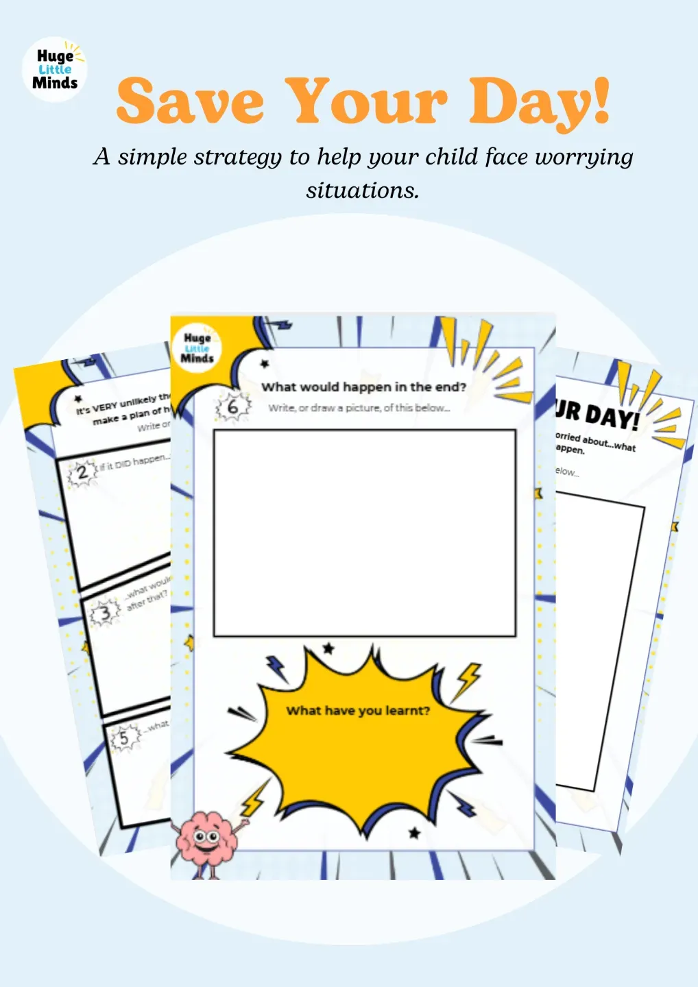 When kids are worried, reassurance like “you’ll be fine” often isn’t enough — they need evidence of this. Save Your Day helps you do provide them with this: guide your child to name their worry, imagine the worst-case scenario, and come up with their own plan to cope.
